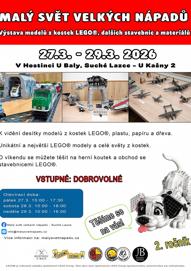 Výstava modelů z kostek LEGO®, dalších stavebnic a materiálů proběhne ve dnech 27. - 29.3.2026 v sále Hostince U Baly v Suchých Lazcích.