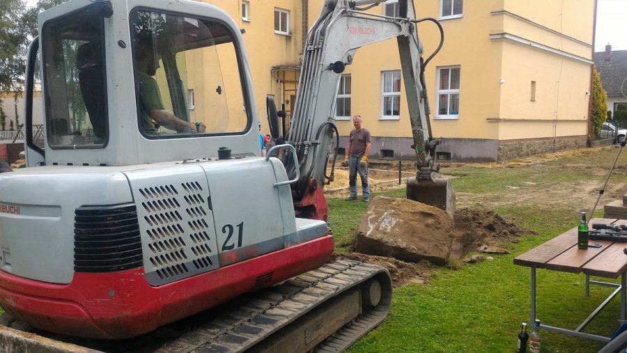 V sobotu 1.7.2017 se od 8:00 hodin konala na školním hřišti první veřejná brigáda zaměřená na rekonstrukci hřiště. Brigáda byla zaměřena na odstranění starých chodníků a přípravu podkladu pro nové chodníky. Současně byly vybagrovány některé staré nefunkční hrací prvky. Betonové základy byly opravdu poctivé a největší betóvnový kvádr, u kterého se zapotil i 3 tunový bagr, měl rozměr 1x1x1m. (do jámy po monolitu byl nasypán písek s vrchní vrstvou hlíny) Část starého chodníku byla z betonového monolitu o rozmětu cca 7x3m a tloušťce 30 cm. V části, kde stávaly kontejnery (přístavba se záchody) byla objevena podzemní místnost z cihel o hloubce asi 1,7m a půdorysu cca 3,5 x 1,6m. Na základech budovy přístavby byly vidět v podzemní místosti tři pilíře a klenby z cihel. Podzemní místnost, ve které bylo cca 15cm vody se sutí, sloužila v minulosti jako žumpa a byla natřená asfaltem. Podařilo se také bagrem vytáhnout kořen starého ořechu. Brigádnící během dne průběžně odcházeli, a práce nakonec skončily v 18 hodin. Celkem se účastnilo 12 dobrovolníků: bagrista Tonda, Petr Orieščík, Mudr. Vít Kašpárek, Václav Skuplík ml., Václav Skuplík st., David Závěšický, David Martínek, Tomáš Ondra, Patrik Knopp, Daniel Stibor, Radim Palzer a Martin Žůrek. Obecní úřad děkuje všem brigádníkům a panu Skuplíkovi st. za zapůjčení traktoru s vlečkou.