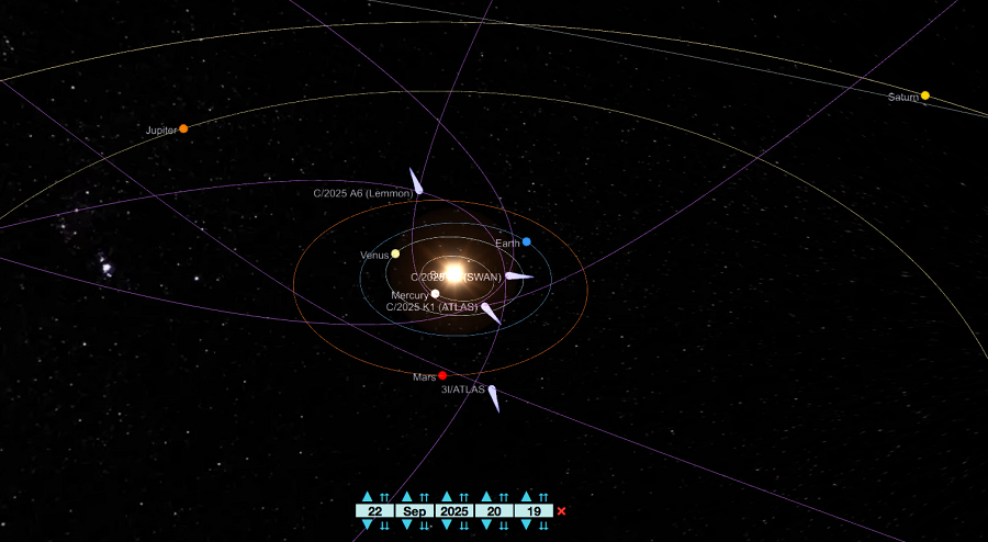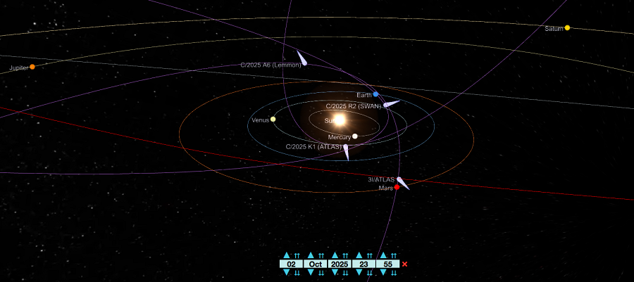 Naproti tomu kometa C/2025 R2 (SWAN) byla poprvé zaznamenána 11.8.2025 astronomem Vladimire Bezuglym a nyní ji můžeme na obloze vidět poblíž Marsu společně s 3I Atlas. Oběžná dráha komety je cca 620 let (±85 let) a je rovněž v nízkém úhlu vůči ekliptice sluneční soustavy. Z astronomického hlediska proletí oba objekty relativně blízko sebe, ale v opačném směru.