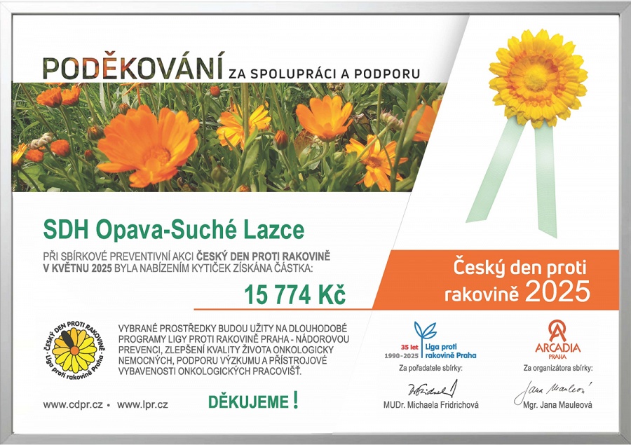 SDH obdrželo poděkování za spolupráci od Ligy proti rakovině za spolupráci při sbírkové preventivní akci Český den proti rakovině v květnu 2025, kdy byla prodejem kytiček vybrána částka 15.774,- Kč. Děkujeme mockrát všem, kteří pomohli příspěvkem nebo zakoupením symbolické žluté květinky přispět touto krásnou částkou. Děkujeme, že pomáháte pomáhat.