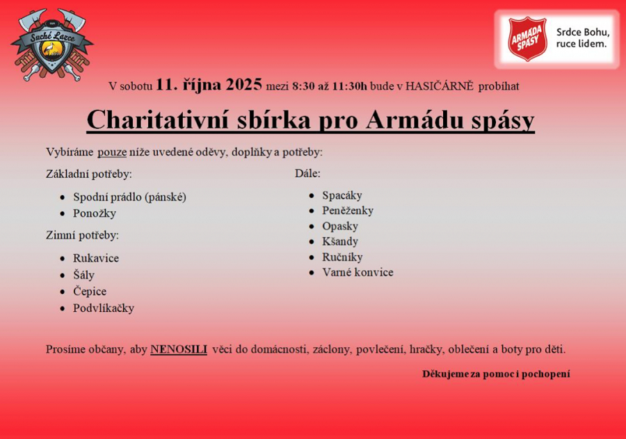 V sobotu 11. října 2025 mezi 8:30 až 11:30 hodinou bude v HASIČÁRNĚ probíhat Charitativní sbírka pro Armádu spásy. Vybíráme pouze níže uvedené oděvy, doplňky a potřeby.