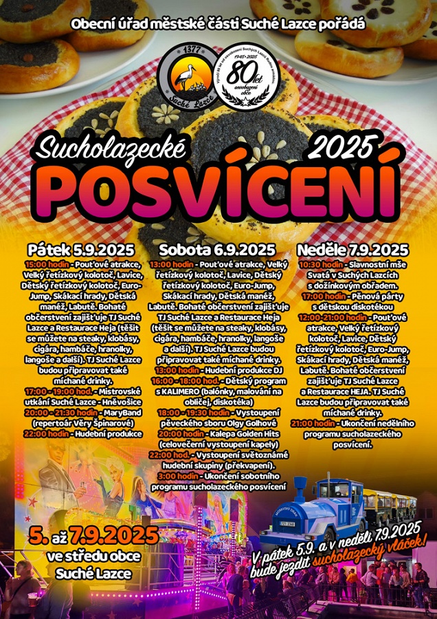 V pátek 5.9.2025 po 15. hodině začalo v naší obci Sucholazecké posvícení 2025. Pátek byl ve znamení teplého počasí. Oblíbený zápas svobodní ženatí letos vystřídalo mistrovské utkání TJ Suché Lazce : Hněvošice s výbornou výhrou Lazia 6:0. Jako každý rok nechyběly pouťové atrakce jako Velký řetízkový kolotoč, Lavice, Dětský řetízkový kolotoč, Euro-Jump, Skákací hrady, Dětská manéž a letos nově také Labutě, které zaznamenaly ohlas u návštěvníků. Oblíbený vláček "Moravský drak" vozil během pátku a neděle nejen děti, ale také dospělé. O občerstvení se postaraly stánky TJ Suché Lazce a Restaurace Heja, který nabízel steaky, klobásy, cigára, hamburgry, hranolky, langoše a další. TJ Suché Lazce, stejně jako minulý rok si připravili míchané drinky. Letos nechyběl také stánek s kávou, točená zmrzlina nebo výborná italská pizza. Hudebním večerem provázela po 20. hodině kapela MaryBand s repertoárem Věry Špinarové, který se všem líbil. Po 22. hodině následovala hudební produkce DJ s písněmi na přání.