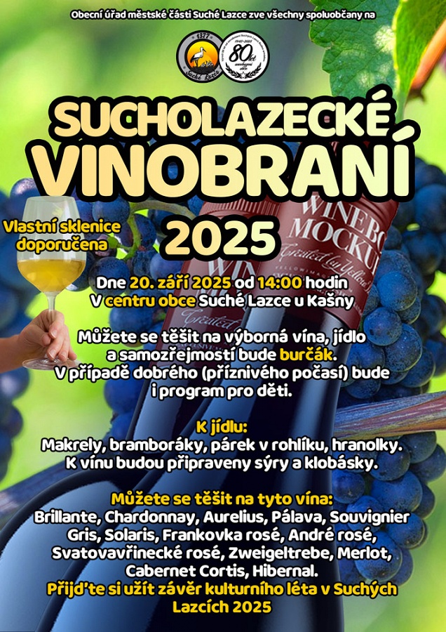 Obecní úřad městské části Suché Lazce zve všechny spoluobčany na SUCHOLAZECKÉ VINOBRANÍ 2025, které se konaá dne 20. září 2025 od 14:00 hodin v centru obce Suché Lazce u Kašny. Můžete se těšit na výborná vína, jídlo a samozřejmostí bude burčák. V případě dobrého (příznivého počasí) bude i program pro děti. K jídlu: Makrely, bramboráky, párek v rohlíku, hranolky. K vínu budou připraveny sýry a klobásky. Můžete se těšit na tyto vína: Brillante, Chardonnay, Aurelius, Pálava, Souvignier Gris, Solaris, Frankovka rosé, André rosé, Svatovavřinecké rosé, Zweigeltrebe, Merlot, Cabernet Cortis, Hibernal.