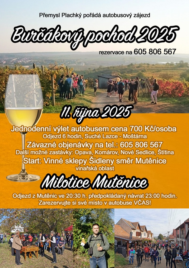 Pan Přemysl Plachký pořádá 11. října 2025 jednodenní autobusový zájezd s názvem Burčákový pochod 2025, do vinařské oblasti Milotice Mutěnice. Cena za autobus je 700 Kč/osobu. Odjezd je v 6 hodin, ze zastávky Suché Lazce střed - Moštárna. Závazně objenávejte na tel. 605 806 567. Pochod začíná od vinných sklepů Šidleny směrem na Mutěnice. Odjezd domů z Mutěnic bude ve 20:30 h. Předpokládaný návrat 23:00 hodin. Zarezervujte si své místo v autobuse VČAS!