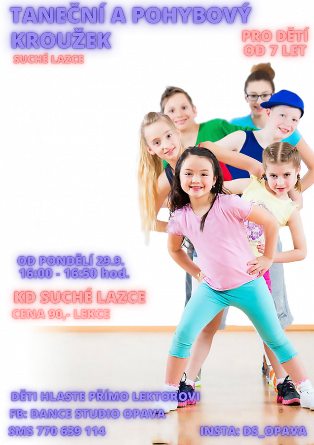 Dance studio Opava zve všechny děti ve věku od 7 let do tanečně pohybového kroužku, který proběhne v kulturním domě Suché Lazce od 29.9.2026 v čase od 16:00 do 16:50 hodin. Cena lekce 90 Kč.
