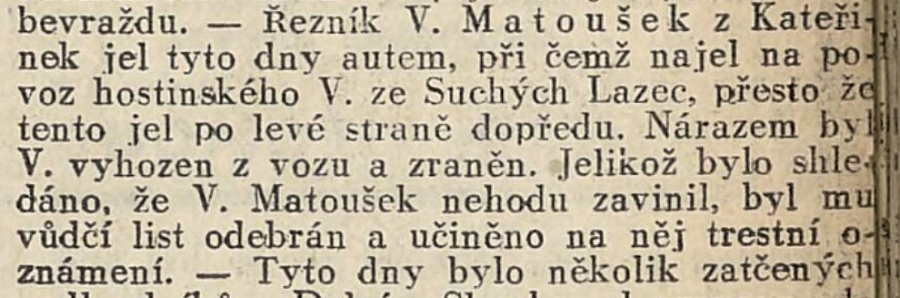 Řezník V. Matoušek z Kateřinek jel tyto dny autem, při čemž najel na povoz hostinského V. ze Suchých Lazec, přesto že tento jel po levé straně dopředu. Nárazem byl V. vyhozen z povozu a zraněn. Jelikož bylo shledáno, že V. Matoušek nehodu zavinil, byl mu vůdčí list odebrán a učiněno na něj trestní oznámení.