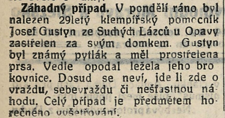 Záhadný případ: V pondělí ráno byl nalezen 29letý klempířský pomocník Josef Gustyn ze Suchých Lazců u Opavy zastřelen za svým domkem. Gustyn byl známý pytlák a měl prostřelená prsa. Vedle opodál ležela jeho brokovnice. Dosud se neví, jde-li zde o vraždu, sebevraždu či nešťastnou náhodu. Celý případ je předmětem horčného vyšetřování.