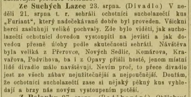 Ze Suchých Lazec 23. srpna. (Divadlo) V neděli 21. srpna 1904 t. r. sehráli ochotníci sucholazečtí kus „Furiant", který nadočekávaně dobře byl proveden. Všickni herci zasluhuji veliké pochvaly. Zde bylo viděti, jak sucholazečtí ochotníci dovedou vystoupiti na jevišti a jak dovedou přesně úlohy podle skutečnosti sehráti. Návštěva byla veliká z Přerovce, Nových Sedlic, Komárova, Kravařova, Podvihova, ba i z Opavy přišli hosté, jenom místní lidé divadlo málo navštěvují. Nevím proč, to přece divadlo jest ze všech zábav nejužitečnější a nejpoučnější. Dontám, že ochotníci sncholazečtí zase si nějaký pěkný kus vyhledají a brzy nás novým vystoupením potěší.