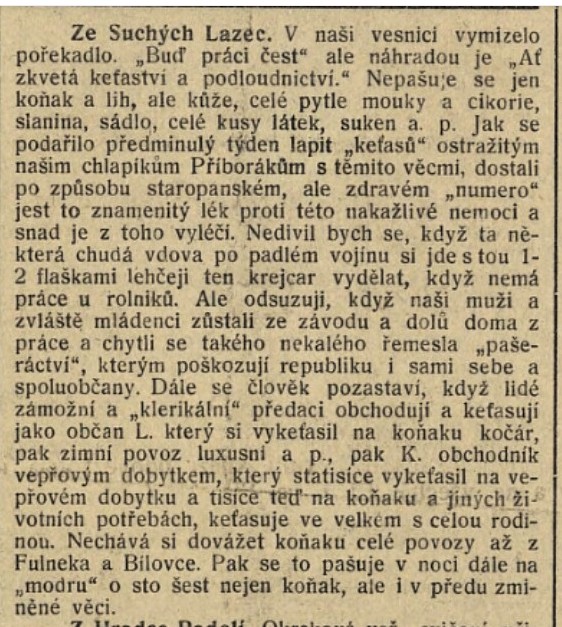 Ze Suchých Lazec - V naši vesnici vymizelo pořekadlo "Buď práci čest" ale nahradou je "ˇAt zkvétá keťaství a podloudnictví." Nepašuje se jen koňak a lih, ale kůže, celé pytle mouky a cikorie, slanina, sádlo, celé kusy látek, suken a podobně. Jak se podařilo předminulý týden lapit "keťasů" ostražitým našim chlapíkům Příborákům s těmito věcmi, dostali po způsobu staropanském, ale zdravém "numero" jest to znamenitý lék proti této nakažlivé nemoci a snad je z toho vyléčí. Nedivil bych se, když ta některá chudá vdova po padlém vojinu si jde s tou 1-2 flaškami lehčeji ten krejcar vydělat, když nemá práce u rolníků. Ale odsuzuji, když naši muži a zvláště mládenci zůstali ze závodu a dolů doma z práce a chytli se takého nekalého řemesla "pašeráctví", které poškozují republiku i sami sebe a spoluobčany. Dále se člověk pozastaví, když lidé zámožní a "klerikální" předáci obchodují a kefasují jako občan L. který si vykeťasil na koňaku kočár, pak zimní povoz luxusní a podobně, pak K. obchodník s vepřovým dobytkem, který statisíce vykeťasil na vepřovém dobytku a tisíce teď na koňaku a jiných životních potřebách, keťasuje ve velkém s celou rodinou. Nechává si dovážet koňaku celé povozy až z Fulneka a Bílovce. Pak se to pašuje v noci dále na "modru" o sto šest nejen koňak, ale i v předu zmíněné věci.
