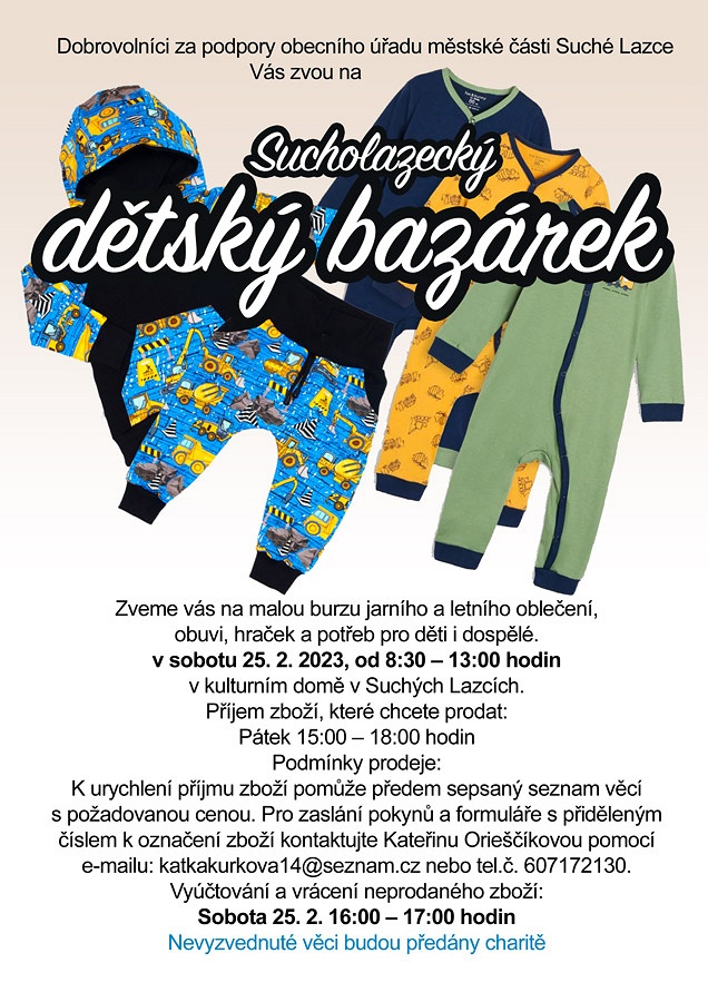 V sobotu 7.10.2023 od 9 do 12 hodin proběhne v hasičárně v Suchých Lazcích charitativní sbírka.