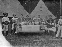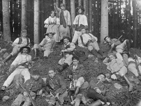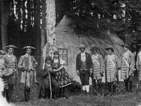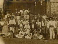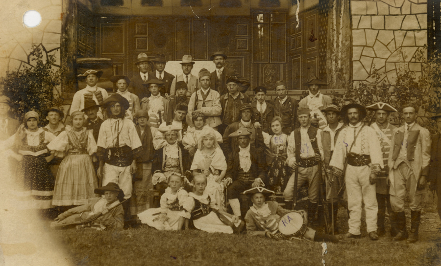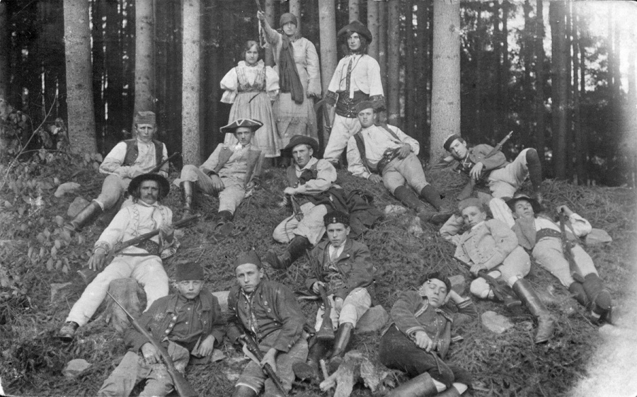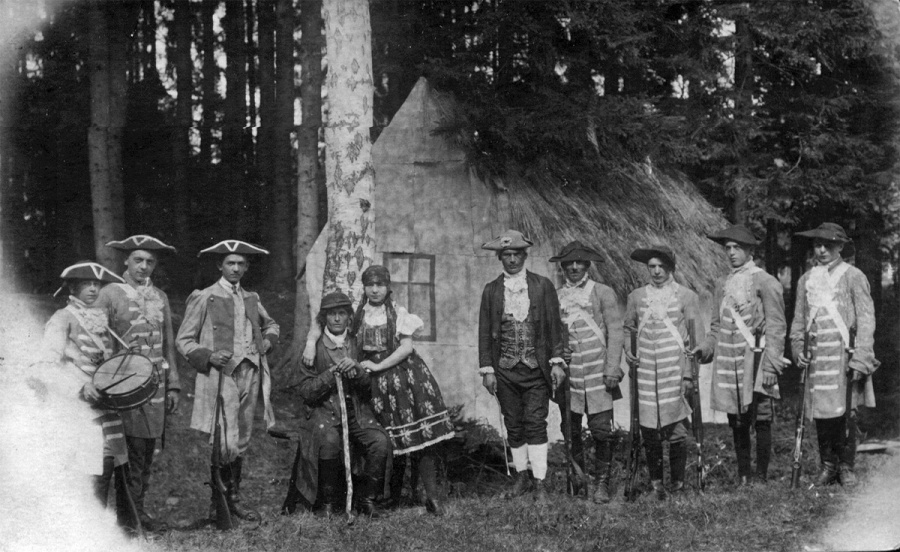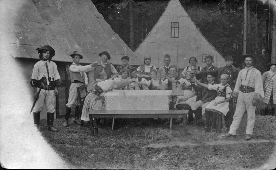 Divadlo v přírodě - „Ondráš a Juráš“ členové Soc. Dem. - Suché Lazce rok 1923. Popis lidí poslední řada zprava: 1. Směja Čeněk, 2. Josef Žůrek 3. Carbol 4. Antonín Malík.