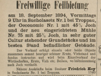 Dobrovolný prodej 18. září 1894 v 9:00 v Suché Lazce č. 1 u Opava, Ekonomika č. 1 s 45 1/2 Joch a nově zřízený Mlýn č. 75 s 25 1/2 Joch, ve velmi dobré kultuře Pozemky a budovy v nejlepším stavu.