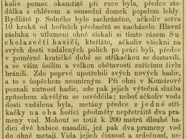 Hlídka hasičská. Hasičské župní jednotě Opavské zaslány byly zprávy požární a sice od sboru Sucholazockého pány Viny. Pchalkem, velitelem a Josefem Černínem jodnatelem o požáru, který 30. prosince 1891 v Nových Sedlicích ve stodole pana Fr. Škrobánka č. 6. o 9. hodině ráno vypuknul a stodolu a kolničku zničil. Poškozený utrpěl škodu asi 1000 zl. a byl u "Mor.-Slezké.“ na 400 zl, a u "rolnické poj." na 668 zl. na obilí pojištěn. Hašení sůčastnily se sbory Sucholazecký a Mokrolazecký dvěma vozovými a jednou ruční stříkačkou. Oheň byl o 10. hodině ráno uhašen.