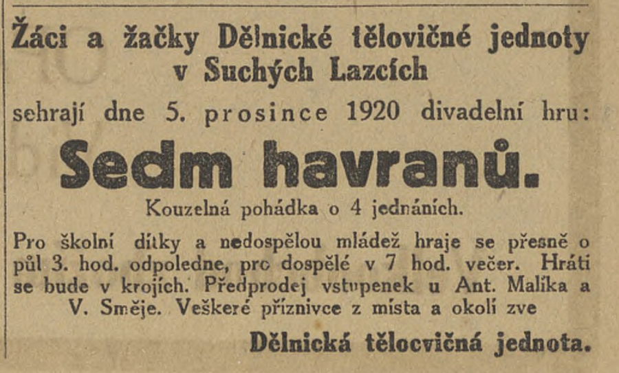 Žáci a žačky Dělnické tělovičné jednoty v Suchých Lazcích sehrají dne 5. prosince 1920 divadelní hru: Sedm havranů. Kouzelná pohádka o 4 jednáních. Pro školní dílky a nedospělou mládež hraje se přeoně o půl 3. hod. odpoledne, pro dospělé v 7 hod. večer. Hráti se bude v krojích. Předprodej vstupenek u Ant. Malíka a V. Směje. Veškeré příznivce z místa a okoli zve Dělnická tělocvičná jednota.