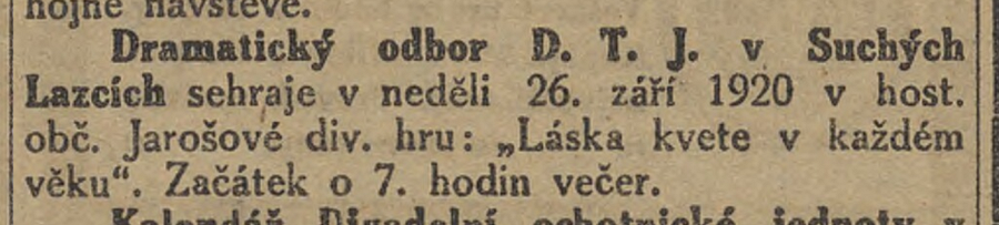 Dramatický odbor D. T. J. v Suchých Lazcích sehraje v neděli 26. září 1920 v host. obč. Jarošové div. hru: „Láska kvete v každém věku". Začátek o 7. hodin večer.