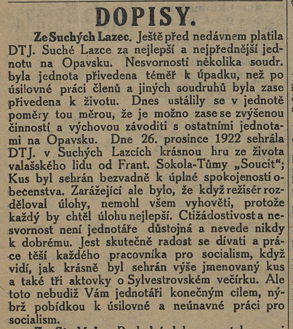 Ze Suchých Lazec. Ještě před nedávnem platila DTJ. Suché Lazce za nejlepší a nejpřednější jednotu na Opavsku. Nesvorností několika soudr. byla jednota přivedena téměř k úpadku, než po usilovné práci členů a jiných soudruhů byla zase přivedena k životu. Dnes ustálily se v jednotě poměry tou měrou, že je možno zase se zvýšenou činností a výchovou závoditi s ostatními jednotami na Opavsku. Dne 26. prosince 1922 sehrála DTJ. v Suchých Lazcích krásnou hru ze života valašského lidu od Frant. Sokola-Tůmy „Soucit"; Kus byl sehrán bezvadně k úplné spokojenosti obecenstva. Zarážející ale bylo, že když režisér rozděloval úlohy, nemohl všem vyhověti, protože každý by chtěl úlohu nejlepší. Ctižádostivost a nesvornost není jednotáře důstojná a nevede nikdy k dobrému. Jest skutečně radost se dívati a práce těší každého pracovníka pro socialism, když vidí, jak krásně byl sehrán výše jmenovaný kus a také tři aktovky o Sylvestrovském večírku. Ale toto nebudiž Vám jednotáři konečným cilem, nýbrž pobídkou k úsilovné a neúnavné práci pro socialism.