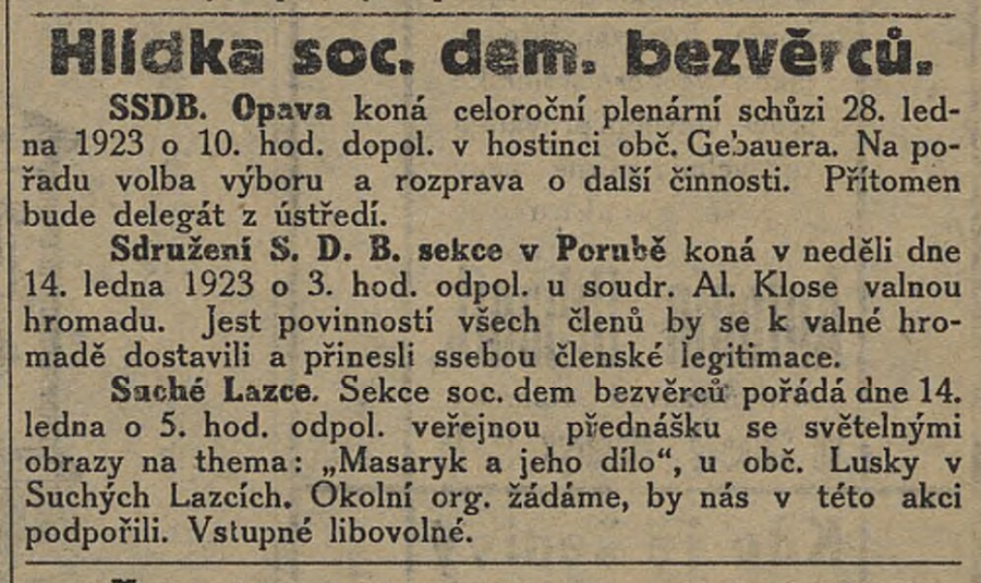 Suché Lazce. Sekce soc. dem bezvěrců pořádá dne 14. ledna 1923 o 5. hod. odpol. veřejnou přednášku se světelnými obrazy na thema: „Masaryk a jeho dilo", u obč. Lusky v Suchých Lazcích. Okolní org. žádáme, by nás v této akci podpořili. Vstupné libovolné.