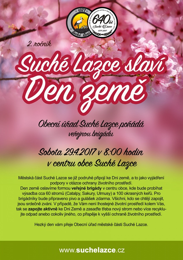 Obecní úřad Suché Lazce pořádá v sobotu 5.5.2018 v 8:00 hodin v centru obce 3. ročník veřejné brigády, pod názvem "Suché Lazce slaví Den země". Suché Lazce se již potřetí připojí ke Dni země, a to jako vyjádření podpory v otázce ochrany životního prostředí. Den země oslavíme formou veřejné brigády v obci, kde bude probíhat: (Sázení nových stromků kolem hlavní cesty, úprava současné výsadby, čištění současné výsadby od plevele, sázení nových keřů - lopaty a hrábě vemte s sebou) Pro brigádníky bude připraveno občerstvení zdarma. Všichni, kdo se chtějí zapojit, jsou srdečně zváni. V případě, že Vám není lhostejné životní prostředí kolem Vás, tak se zapojte aktivně ke Dni Země a zasaďte třeba nový strom nebo více recyklujte odpad anebo cokoliv jiného, co přispěje k vyšší ochraně životního prostředí.