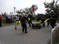 Naše přípravka v poloviční sestavě předvedla svůj trénink, kdy se učí přebíhat kladinu, přelézat bariéru, obíhat kužely tzv. slalomem, podlézat a prolézat překážky. Po písknutí utíkali kluci předvést požární útok a holky se rychle převlékly za zdravotnice. Po uhašení požáru party stanu kluky dala děvčata první pomoc malé panence. Celá ukázka se bez obtíží zdařila a drobné chybičky nás vedoucí rozesmály. První odměnou byl potlesk diváků. Po ukázce vždy celé družstvo nastoupilo a bylo po zásluze odměněno památeční medailí, plaketou pro sbor a děti si odnesly domů i tašku s drobnými dárečky. Místní sbor nás mile překvapil, pro děti byly připraveny různé aktivity, jako např. kolotoč, skákací hrad, ale také nádrž s vodou a mlhoviště, kde se mohl každý osvěžit. Jelikož celá akce trvala od 13. až do 19. hodiny, nechybělo ani bohaté občerstvení.