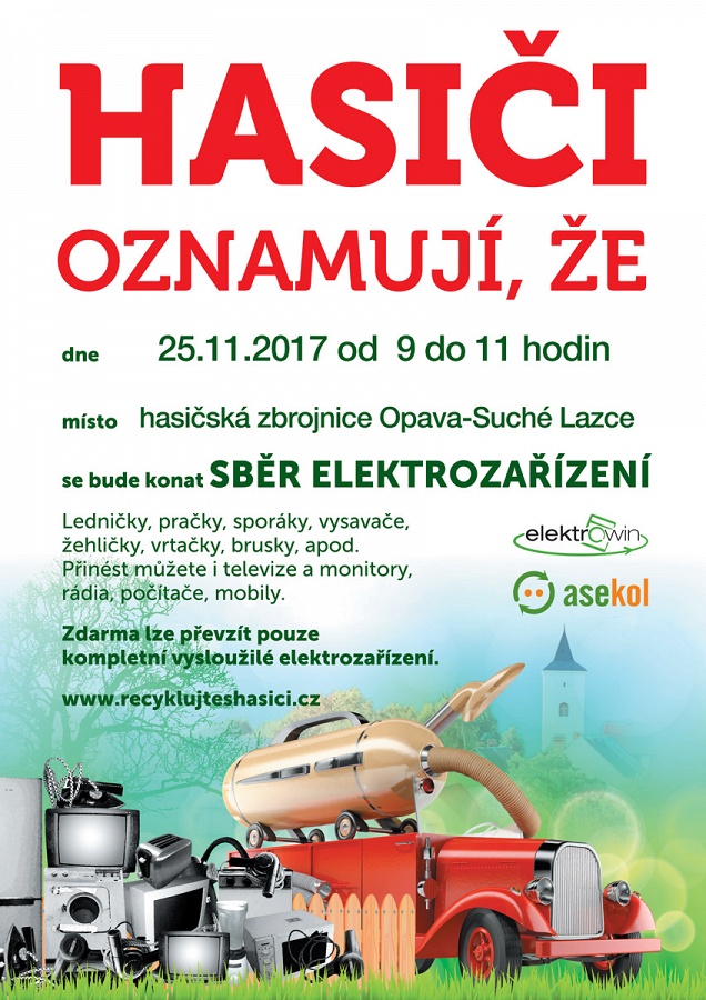 SDH Suché Lazce oznamuje, že dne 13.4.2019 od 9 do 12 hodin se bude konat u hasičské zbrojnice Opava-Suché Lazce sběr elektrozařízení. Můžete donést staré ledničky, pračky, sporáky, vysavače, žehličky, vrtačky, brusky, apod. Přinést můžete také televize, monitory, rádia, počítače a mobily. Zdarma lze přivést pouze kompletní vysloužilé elektrozařízení.