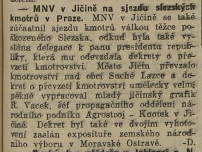 MNV v Jičíně na sjezdu slezských kmotrů v Praze. MNV v Jičíně se také zúčastnil sjezdu kmotrů válkou těžce poškozeného Slezska, odkud byla také vyslána delegace k panu presidentu republiky, která mu odevzdala dekrety o převzetí kmotrovství nad obcí Suché Lazce a dekret o převzetí kmotrovství umělecky velmi pěkně vypracoval mladý jičínský grafik R. Vacek, šéf propagačního oddělení národního podniku Agrostroj - Knotek v Jičíně. Dekret byl také ve dvojím vyhotovení zaslán expozituře zemského národního výboru v Moravské Ostravě.