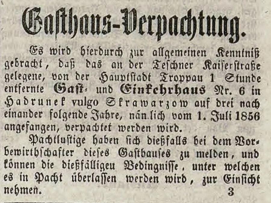 "Pronájem hostince. Tímto se oznamuje k veřejnému prohlášení, že hostinec a restaurace č. 6 v Hadrunneku, známém také jako Krawarzow, nacházející se na Teschner Raiserstrasse, hodinu od hlavního města Troppau, bude pronajat na tři po sobě jdoucí roky, počínaje 1. červencem 1856. Zájemci o pronájem hostince by se měli obrátit přímo na hostinského a mohou si prohlédnout platné podmínky, za kterých bude hostinec pronajat."