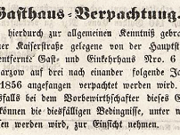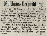 1856/4 Troppauer zaitung - Gasthaus-Verpachtung. Es wird hierdurch zur allgemeinen Renninik gebracgt, das das an der Teschner Raiserstrase gelegne, bon der Hauptstadt Troppau 1 Stunde entsernte Gast und Sintehrhaus Nr. 6 in Hadrunnek vulgo Skrawarzow auf drei nach einander folgende Hahre, nänlich vom 1. Juli 1856 angesangen, verpachtet werden wird. Pachtlustige haben sich dieksaus bei dem Borbewirthschaster dieses Gastheuses zu melden, und können die dieksälligeu Bedingisse, unter melchen es in Dacht überlassen merden mird, zur Einsicht nehemen.