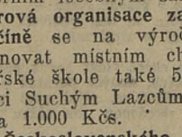 Odborová organisace zaměstnanců ČSD v Jičíně se na výroční schůzi usnesla věnovat místním chudým 500 Kčs, mateřské škole také 500 Kčs, a slezské obci Suchým Lazcům - kmotřenci města 1.000 Kčs.