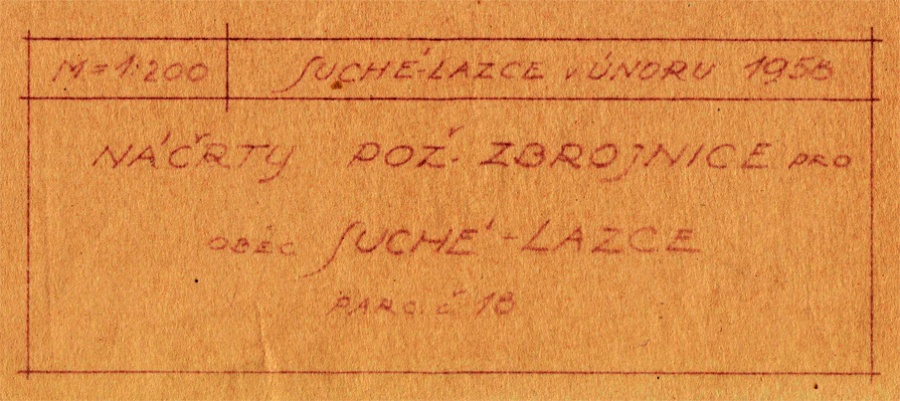 Plány hasičkého sboru v Suchých Lazcích v minulosti rozhodně nebyly malé. Dokladem toho je náčrt hasičské zbrojnice z února 1958. Požární zbrojnice měla být na parcele č. 18 naproti současné požární zbrojnice (ulice Ve dvoře, na parcele pana Lumíra Jelonka). Existovaly dvě variantní řešení budovy. 1. Drahší verze tzv. "Volný návrh" s odhadem nákladů 450 tis. Kčs byl řešen jako přízemí, patro a podkroví. (viz vizualizace 1. varianta ) Rozměr budovy u tohoto řešení počítal s velikostí půdorysu 21 x 10,9 metrů a výška věže měla dosahovat 14 m.