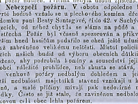1883/3 Opavský Týdeník - Nebezpečí požáru. V sobotu odpoledne ke čtvrté hodině vzňalo, se u plechového komína dřevo v domku paní Beaty Sontagové, číslo 42. v Suchých Lazeich, od něhož chyta se sláma na půdě a od té střecha. Požár byl včasně spozorován a překvapivším hned hasičům podařilo se oheň ještě udusiti, čímž zabráněno velikému neštěstí. Místní policii v obcich našich budiž od výboru obecních důtklivě uloženo, aby podrobila komíny a sousedství jejich v obci náležité prohlídce, neb zhusta se stává, že na venkově požáry nedbalým dohledem a ještě větší nedbalosti majetníků stavení vznikají u kominů, a malé příčiny mívají pak nedozírné následky, často se již stalo, že zaviněnou nedbalost takovou celá obec lehla požárem.