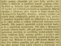 Z Kravařova 10. října. (Oheň.) Ve středu 9. t. m. o 11. hod. před polednem vypukl při panujícim silném vichru neznámým způsobem oheň ve stodole p. Solného, bednáře v Kravařově. Ačkoliv pomoc okamžitě při ruce byla, předce stodůlka s chlévem a sousední domek popelem lehly. Bydliště p. Solného bylo zachráněno, ačkoliv sotva 10 kroků od hořících předmětů se nacházelo. Hlavní zásluhu o utlumení ohně získali si timto rázem Sucbolazečtí hasiči, kteřížto, ačkoliv všickni na svých dosti vzdálených polích po práci byli, předce v poměrně kratičké době se stříkačkou se dostavili, a se vším úsilím a velkou obětavostí zuřícímu živlu bránili. Zde poprvé upotřebili svých nových hadic, a to s úspěchem nesmírným. Při ohni v Komárově poznali nutnost hadic, zde pak jejich výtečná služba způsobem skvělým se osvědčila; neboť ačkoliv voda dosti vzdálena byla, metány předce z jedné stříkačky na oba hořící předměty nepřetržitě dva prameny vod. Mohouť se totiž k 200 metrů dlouhé hadici dvě hubice nasaditi, jež pak dva prameny vod do ohně metaji. Vida jejich činnosť a srdečnost, nemohl jsem se dosti nadiviti jak přičinlivosti hasičů, tak výborné práci stříkačky. Sláva statečným hasičům Sucholazeckým a jich podnikavému panu hejtmanu!
