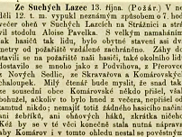 Ze Suchých Lezec 13. října. (Požár.) V neděli 12. t. m.(12.10.1890) vypukl neznámým způsobem o 7. hod. večer oheň v Suchých Lazcích na Strážnici a strávil stodolu Aloise Pavelka. S velkým namaháním, jak hasičů tak lidu, bylo obytné staveni asi dva metry od požařiště vzdálené zachráněno. Záhy dostavili se na požařiště naši hasiči, také okolního lidu dostavilo se mnoho jako z Podvihova, z Přerovce, z Nových Sedlic, ze Skravařova a Komárovských chaloupek. Milý čtenář bude myslit, že snad také ze sousední obce Komárovské někdo přišel, však bohužel, ačkoliv to bylo hned z večera, nepřišel odtamtud nikdo; nemají totiž žádného hasicího načiní, ani žebříků, ani ohňových háků, zkrátka ničeho. Kéž by se v té věci konečně stala nutná náprava, aby Komárov i v tomto ohledu nestal se pověstným.