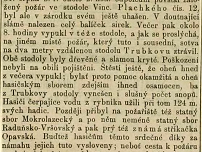 1891/9 Opavský týdeník - Ze Suchých Lazec 1. záři. (Požár.) V pondělí 31. srpna b. r. okolo 2. hod. odpolední povstal založený požár ve stodole Vinc. Plachkého čís. 12, byl ale v zárodku svém ještě uhašen. V doutnající slámě nalezen celý balíček sirek. Večer pak okolo 8. hodiny vypukl v téže stodole, a jak se proslýchá, na jiném místě požár, který tuto i sousední, sotva na dva metry vzdálenou stodolu Trubkovu ztrávil. Obě stodoly byly dřevěná a slamou krytá. Poškození nebyli na obilí pojištěni. Štěstí ještě, že oheň hned z večera vypukl; bylať proto pomoc okamžitá a oheň hasičským sborem zdejším ihned osamocen, ba z Trubkovy stodoly vynešen i slušný počet snopů. Hasiči čerpajíce vodu z rybníka užili při tom 124 m svých hadic. Později přibyl na požařiště též statný sbor Mokrolazecký a po něm neméně statný sbor Raduňsko-Vršovský a pak prý též známá stříkačka opavská. Budtež hasičům těmto srdečné díky za námahu jejich tuto vysloveny; neboť cesta k požáru v obci cizí zůstane vždy nepovinnou obětí hasičstva, vždy spojenou jen se Škodou na nářadí hasičském.