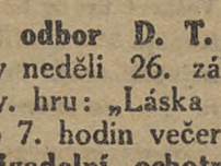 Dramatický odbor D. T. J. v Suchých Lazcích sehraje v neděli 26. září 1920 v host. obč. Jarošové div. hru: „Láska kvete v každém věku". Začátek o 7. hodin večer.