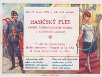 Dne 2. února 1935 o půl 8. hod. večerní proběhne HASIČSKÝ PLES sboru dobrovolných hasičů v Suchých Lazcích. V sále br. Josefa Lusky. Hudba smyčcová - Vstupné za os. 5 Kč. K hojné účasti uctivě zve Sbor.