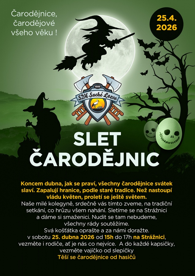 Od 15:00 hodin proběhne na Strážnici v areálu střelnice tradiční "Slet čarodějnic 2026" se smažením vajec. (pořádá SDH Suché Lazce) akce pro děti i dospělé. Pozvánka.