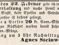 1857/2 Troppauer zaitung - Conntag der 22. Februar gebe ich in Hadrunnek eine Tanz: Unterhaltung und mache hiemit meine ergebenste Einladung. Für Musik, kalte Speisen und Retränke insbesonders Schwechater Märzenbier ist besteus gesorft. Rntrée a Person 20 kr. Cons. Münze. Stellwägen zur Rücksahrt werden stehen und kostet a Person 10 kr. Cons. Münze. Unsang um 3 Uhr Rachmittags. Agnes Steinwendner.