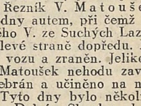 Řezník V. Matoušek z Kateřinek jel tyto dny autem, při čemž najel na povoz hostinského V. ze Suchých Lazec, přesto že tento jel po levé straně dopředu. Nárazem byl V. vyhozen z povozu a zraněn. Jelikož bylo shledáno, že V. Matoušek nehodu zavinil, byl mu vůdčí list odebrán a učiněno na něj trestní oznámení.