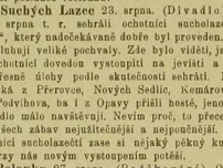 Ze Suchých Lazec 23. srpna. (Divadlo) V neděli 21. srpna 1904 t. r. sehráli ochotníci sucholazečtí kus „Furiant", který nadočekávaně dobře byl proveden. Všickni herci zasluhuji veliké pochvaly. Zde bylo viděti, jak sucholazečtí ochotníci dovedou vystoupiti na jevišti a jak dovedou přesně úlohy podle skutečnosti sehráti. Návštěva byla veliká z Přerovce, Nových Sedlic, Komárova, Kravařova, Podvihova, ba i z Opavy přišli hosté, jenom místní lidé divadlo málo navštěvují. Nevím proč, to přece divadlo jest ze všech zábav nejužitečnější a nejpoučnější. Dontám, že ochotníci sncholazečtí zase si nějaký pěkný kus vyhledají a brzy nás novým vystoupením potěší.