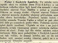 1891/12 Opavský týdeník - Požár v Suchých Lazcích. Ve středu večer vypukl oheň ve stodole Jana Plachkého a následkem velkého větru byli hned oba sousedé v ohni, obydelné stavení Vincenc Halška s jedné a stodola Vítkova ze strany druhé. Obytné stavení Vítkovo a staveni souseda druhého uhájeny přičiněním místního sboru hasičského. Pojednou začalo hořeti u třetího souseda Tomáše Vaška a odtud se pak oheň šířil dále po sousedech podle větru. Požárem zničeno úplně devět usedlosti. Chytalo se sice i na jiných místech, avšak všestranná pomoc zabránila dalšímu šíření se ohně. Požár byl dle všeho založen rukou zločinnou. Bída mezi pohořelými v Suchých Lazcích jest tak veliká, že nemají ničeho, ani co do úst. Budou míti smutné svátky vánoční, pak-li se o ně nepostarali lidumilní sousedé.