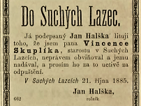 1885/10 Opavský Týdeník - Do Suchých Lazec. Já podepsaný Jan Halška lituji toho, že jsem pana Vincence Skuplika, starostu v Suchých Lazcích, neprávem obviňoval a jemu nadával, a prosím ho za to uctivě za odpuštění. V Suchých Lazcich 21. října 1885. Jan Halška, rolník.