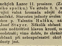 1886/12 Opavský Týdeník - Ze Suchých Lazec 11. prosince. (Založení hasičského spolku.) Ve středu 8. t. m. byla u nás ustavující valná hromada zdejší dobrovolné jednoty hasičské. Starostou jednoty zvolen byl představený obce p. Valentin Halška, náčelníkem rolník p. Josef Steyer. Několik občanů sice nad novotou touto nedůvěřivě hlavou kroutí, nás hasiče to však neodstraší ; víme dobře, že chrániti život a majetek občanů při nebezpečenství ohně jediným účelem jednoty jest.