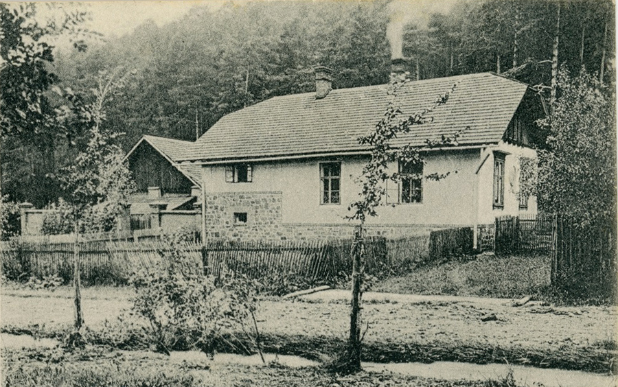Hájenka byla častým výletním místem, kdy kolem ní procházeli výletníci. Na foto švagři Max Hahn, Josef Gřešek, Bohumil Slaný a učitel Ludvík Rozsypal se svými rodinami na procházce před hájovnou. Foto cca 1940.