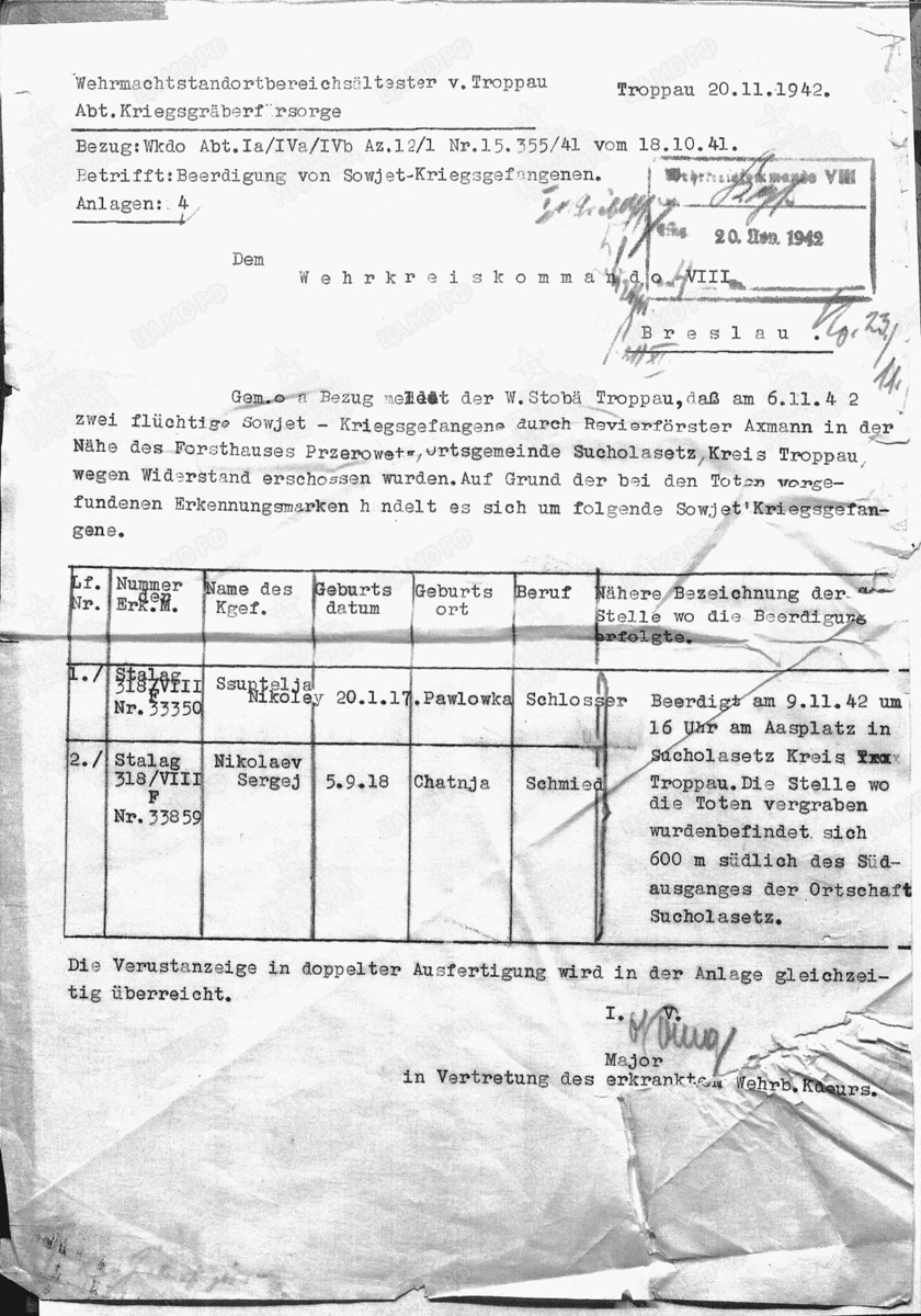 Aktualizace 25.5.2021 - Ve spolupráci s našim čtenářem panem Romanem Janasem (Muzeum obce Česká Ves) se podařilo dohledat jména těchto dvou padlých zajatců. První zajatec Sergej Ivanovič Nikolajev narozen 5.9.1918 ve vesnici Chotnja v Tatarstánu, zajat v Charkově. (jednotka Stalag 318/VIII F, číslo 33859) byl ve věku 24 let zastřelen německým revírníkem O. Axmannem. Druhý zastřelený sovětský zajatec byl Ukrajinec Nikolaj Gordejevič Suptelja narozen 19. prosince 1917(20.1.1917) ve vesnici Pavlovka. Zajat byl v Charkově 26. května 1942. Prošel i táborem Stalag VIII F (318). Je to ten muž, který byl střelen do břicha. Zemřel ve věku 25 let.