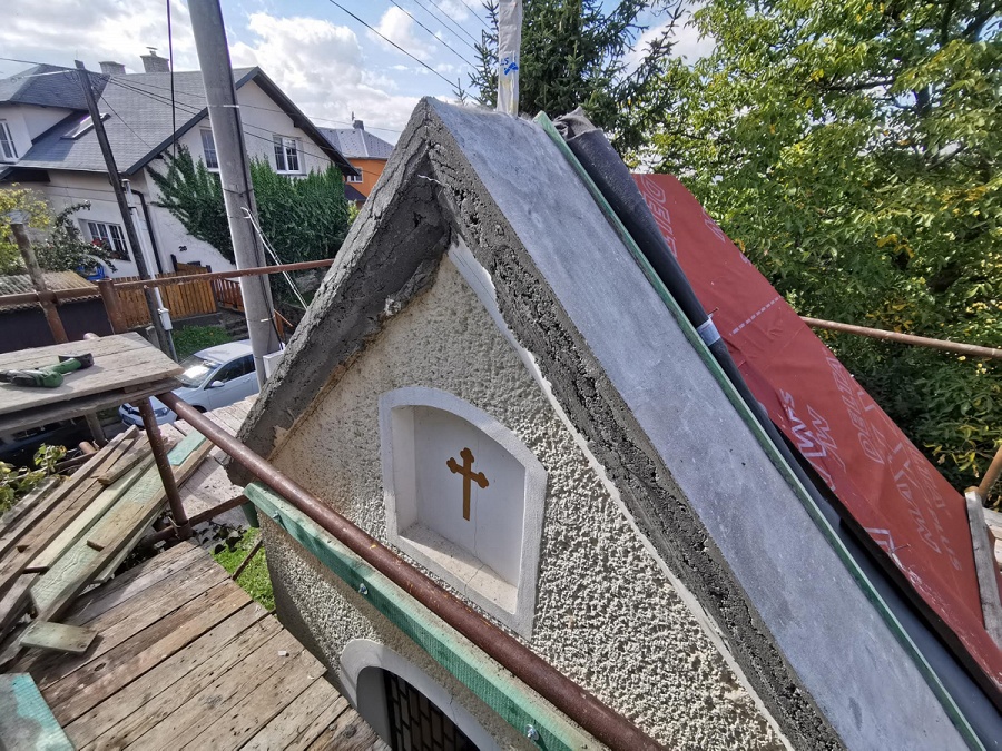 Celá střecha přošla v srpnu zásadní opravou, kdy byl vytvořen nový krov. Střecha je nově pokryta břidlicí na měděných hřebících dle původního vzhledu. Během září jsme museli provést opravu předezdívky (štítu), která byla dozděna a upravena tak, aby stejně jako v minulosti převyšovala střechu za štítem. Začátkem září jsem provedl renovaci kříže, kterou jsme si nechali nacenit u odborné firmy. Ta cenu odhadla na 24 tis. bez DPH. Proto jsem po domluvě s restaurátorem Tomášem Oršovým provedl renovaci sám, dle odborných postupů RE-art a samotné nanesení plátkového zlata provedl Tomáš zdarma. Protože byla silueta Krista silně poškozena (prorezivělá, uvnitř velká díra) vystřihnul jsem koncem srpna z plechu kopii původní siluety, natřel ji ochrannými nátěry a nakreslil nového Krista. Ježíš je uchycen na kříži původními kovanými hřeby, které jsou do kříže "zatemovány". Renovovaný a pozlacený kříž s Kristem tak nakonec vyšel na pouhých 2.698,- Kč (plátkové zlato) + 1.706 Kč (alkyton, tanin, štětce), práce byla zdarma. Podařilo se tak ušetřit značnou částku.