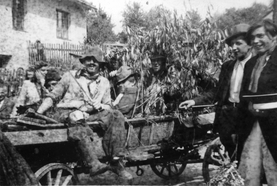 Skupina na korbě náklaďáku před hostincem Bílý anděl