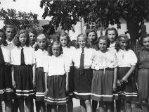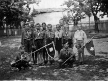 Skupinové foto rok 1946 před vchodem do hostince Bílý anděl