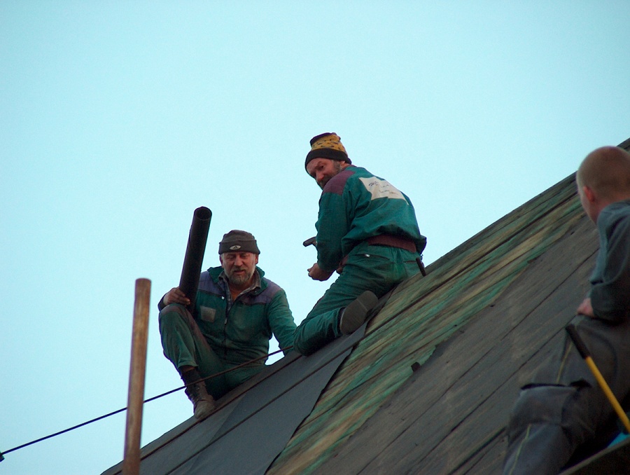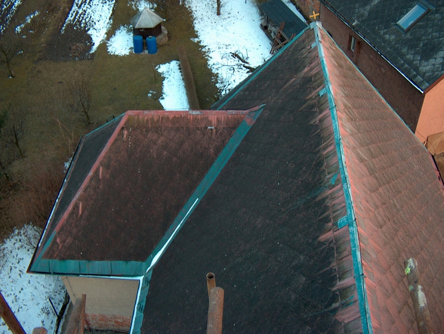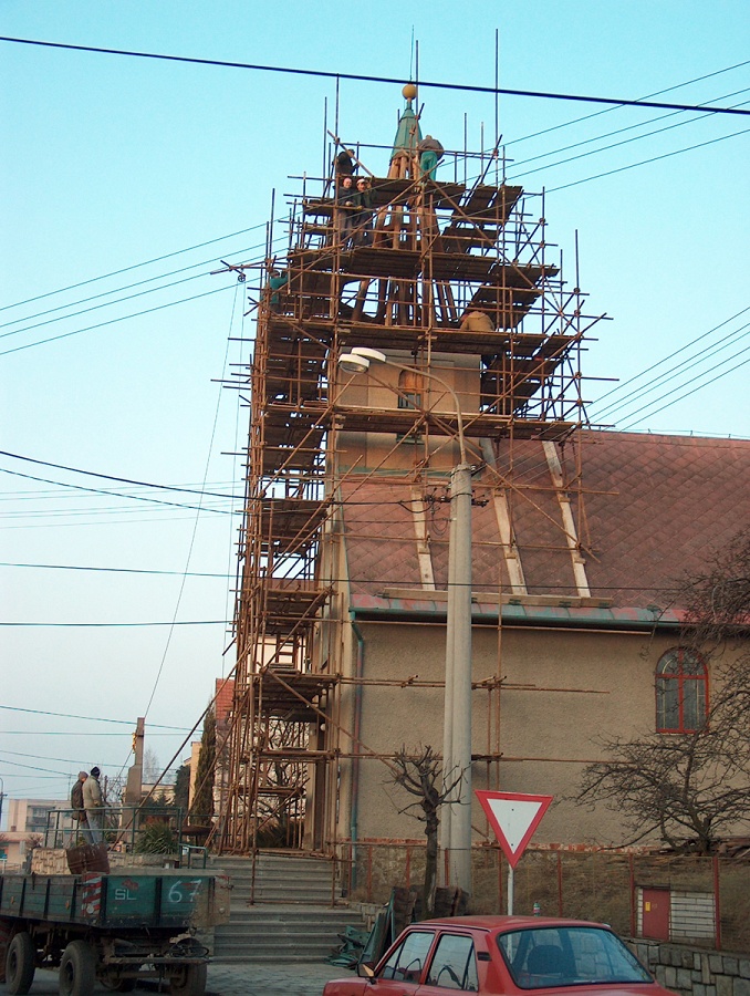 V březnu 2003 proběhla zásadní rekonstrukce věže. Původně byla plánovaná pouze výměna oplechování věže, avšak zub času nahlodal dřevěnou konstrukci věže natolik, že bylo nutné provést úplnou rekonstrukci. Fotografie ukazují stupeň poškození a byly pořízeny v rozmezí od 1.3.2003 do 10.3.2003, kdy došlo k této rekonstrukci. V další fázi zhruba od 22.3.2003 probíhalo odstranění staré krytiny, nátěr bochemitem a následná příprava pro položení nové krytiny. (foto: David Závěšický)