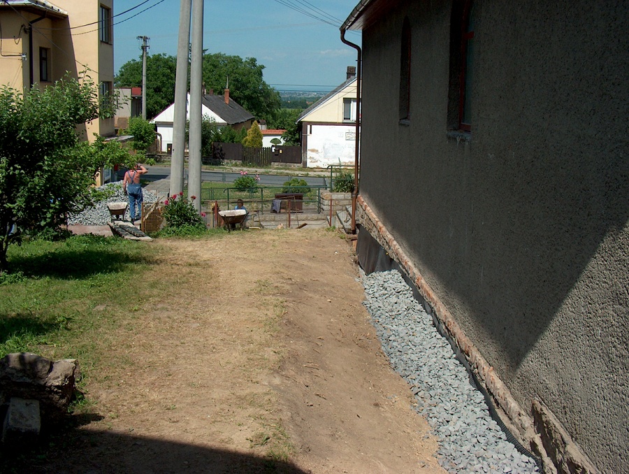 Ukázka rozsahu prací na sucholazecké kapli v měsíci červnu roku 2003. V tomto měsíci probíhalo především vysušování základového zdiva a položení odvod'novacích drenáží. Toto řešení sanace se v průběhu času ukázalo jako velmi účinné. (foto: David Závěšický)