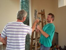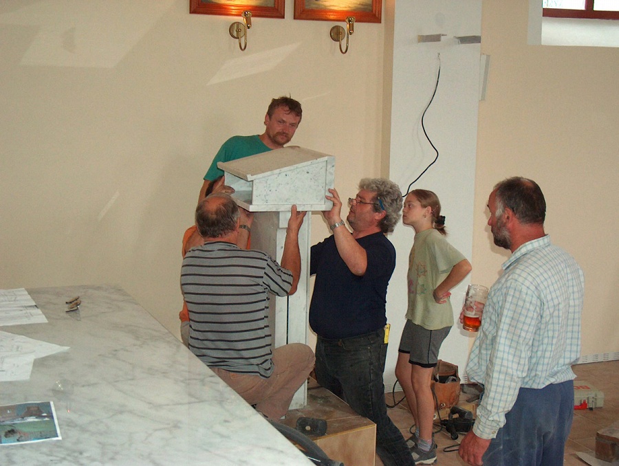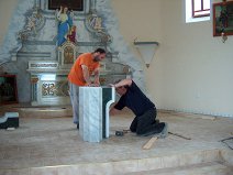 V srpnu 2004 probíhala realizace venkovních omítek, instalace mramorového oltáře, oprava hodinového mechanizmu, seřízení vyzváněcího systému zvonů, oprava varhan, usazení dřevěného zábradlí, montáž přístřešku a mnoho dalších úprav. (foto: David Závěšický, Barbora Sosnová)
